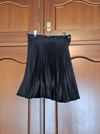 Falda negra con un diseño plisado. - En buen estado. - Usado pocas veces. - 45/46 cm de largo. - Cintura con cierre lateral de botón y cremallera. - Tejido satinado.