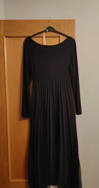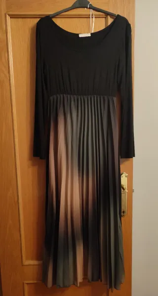 Vestido largo con un diseño elegante y moderno. - Cuerpo superior negro de manga larga. - Falda plisada con efecto degradado , y liso negro por detrás. Talla única, que da mucha talla. Como nuevo, puesto en un par de ocasiones. Se lleva a casa si es Zaragoza o alrededores