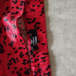 Falda larga con un estampado llamativo. - Diseño fluido y cómodo. - Estampado de manchas negras sobre fondo rojo.
