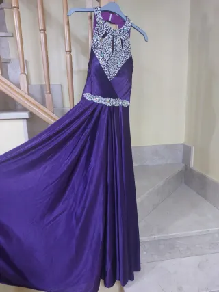 Elegante vestido largo de fiesta en tono morado brillante. Diseñado para eventos especiales, este vestido destaca por su caída y detalles. - Escote adornado con pedrería. - Cintura marcada con detalles brillantes. - Falda larga y fluida. Buena calidad.