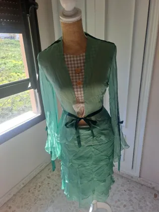 Elegante conjunto de dos piezas, ideal para eventos especiales. Diseñado para destacar con un estilo único. - Chaqueta larga con mangas acampanadas. - Falda con volantes. - Cinturón de lazo. - Detalle de encaje en el escote.
