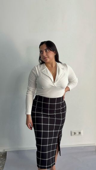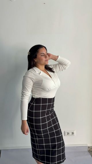 Elegante conjunto de falda y blusa. - Falda de corte recto con estampado de cuadros. - Blusa de manga larga con cuello.