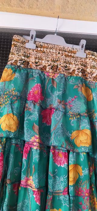 Preciosa falda con goma en cintura, mucho vuelo, cordon de algodon. Paso medidas a continuacion pecho 80-90 cm goma caderas 140 cm Largo 85 cm volante 26 cm, vuelo volante 2,20 cm. Hilitos de brillo