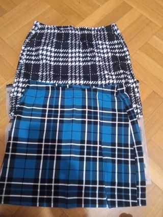 lote oferta de 2 faldas mini faldas nuevas marca shein talla M 38 . cm de largas 39 cm. de cintura 34 cm aprox con sus bolsas nuevas composiciones 95 poliéster 5 elástico las 2 por 5 euros buen precio barato oferta promoción