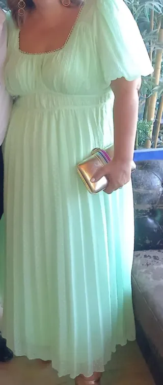 Elegante vestido largo en color verde, con un diseño plisado y detalles sutiles. - Escote cuadrado con borde decorativo. - Mangas cortas abullonadas. - Cintura elástica. - Falda larga plisada con pequeños topos.