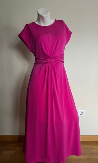 Vestido fucsia drapeado a la cintura con falda evasé. Largo midi, sin mangas, ajustado a la cintura. Es de punto de seda por lo que tiene mucha caída.