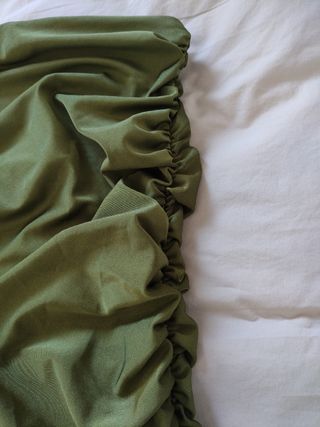 Falda larga de color verde con un diseño fruncido en un lateral. - Tejido elástico. - Largo hasta el tobillo.