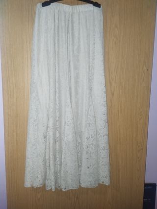Elegante falda larga con un delicado diseño de encaje. - Tejido con patrón floral. - Corte fluido y vaporoso. Lleva forro debajo Talla única que da hasta la talla 50