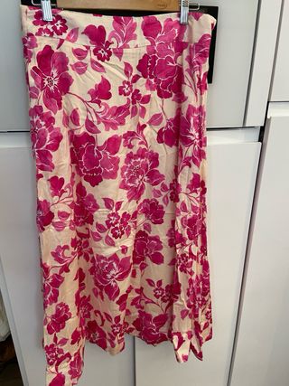 Falda larga de color fucsia con un diseño elegante y detalles brillantes, lentejuelas - Diseño con motivos florales y paisley. - Ribete inferior con estampado. - Cierre de cremallera lateral. 79cm de largo Vivo en Madrid y puedo entregar en mano