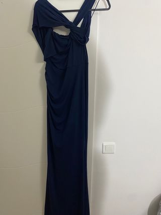 Elegante vestido de fiesta largo en color azul. - Diseño de un solo hombro. - Falda voluminosa con varias capas. - Detalle de tirantes adornados en la espalda. - Lazos en la espalda para ajuste.