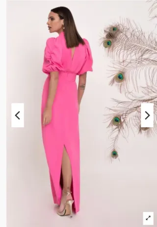 Elegante vestido de fiesta de Matilde Cano, ideal para invitadas. Nuevo a estrenar con etiqueta. - Diseño cruzado en el cuerpo. - Cintura marcada con detalle plisado. - Falda larga con plisado vertical. - Mangas largas abullonadas.