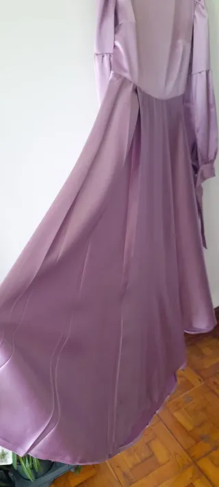 Elegante vestido largo de tela satinada en tono lila. - Diseño con cuello redondo. - Mangas largas abullonadas. - Cintura marcada con detalle de pliegues. - Falda larga con caída fluida.