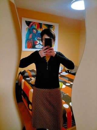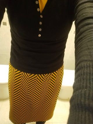 Poco usada, tacto de punto, interior felpa, dibujo geométrico muy versátil, color mostaza y negro. Largo por encima de la rodilla y cintura de goma elástica.