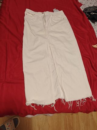 Falda vaquera larga de color blanco con un diseño moderno y desgastado. - Cintura alta. - Abertura frontal. - Bajo deshilachado. -tiene una pequeña mancha De ahí su precio