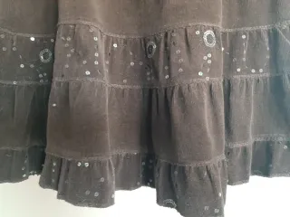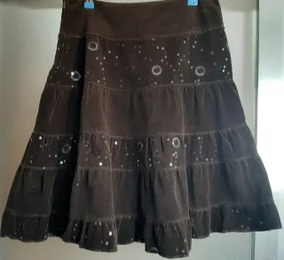 Se vende falda de pana fina de color marrón con diseño de volantes y flores de lentejuelas bordadas. Por encima de la rodilla (54 cm de largo). Talla 38. En muy buen estado.