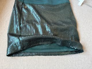 Falda corta con lentejuelas de color verde oscuro. Talla XS / 36. Tiene goma para la cintura y forro de tela por dentro. En perfecto estado. Únicamente tiene un pequeño hilo en la parte trasera como se ve en la foto, que prácticamente no se aprecia.