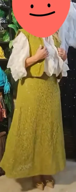 Conjunto espectacular de falda y chaleco con un diseño único. - Chaqueta sin mangas con lentejuelas. - Falda larga a juego. - La falda lleva cinturilla de goma elastica color kaki con su forro h sus piedras.. la falda sirve desde la talla 38 a la 42 incluido..el precio es por el conjunto