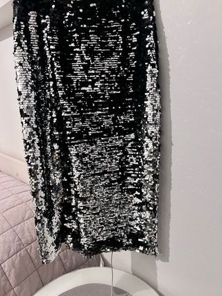 Falda de lentejuelas con un diseño bicolor. Les puedes dar la vuelta a las lentejuelas y cambiara de color de plata a negro. - Lentejuelas plateadas y negras. - Diseño recto. Cremallera lateral. Elástico en la cintura.