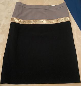 Falda de mujer con un diseño moderno y elegante. - Parte superior en tono gris. - Banda decorativa con lentejuelas doradas. - Parte inferior en color negro.