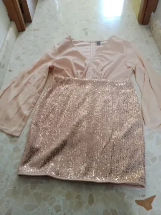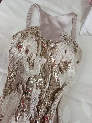 Elegante vestido de fiesta largo con detalles de lentejuelas. - Diseño con escote pronunciado. - Abertura lateral en la falda. - Tejido ligero y con caída. Usado en 2 ocasiones. Bastante ceñido a la cintura. Con escote pronunciado y de tirantes finos y descubierto en la espalda. Color beige o Champagne. Precio no negociable.