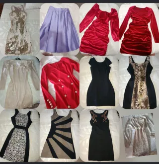 Conjunto de ropa de mujer que incluye varios vestidos y una falda. - Vestido con lentejuelas doradas y plateadas. - Falda plisada en color lila. - Vestido rojo de manga larga. - Vestido negro con escote. - Vestido con estampado de leopardo. - Vestido negro con detalles bordados. - Vestido beige de manga larga.