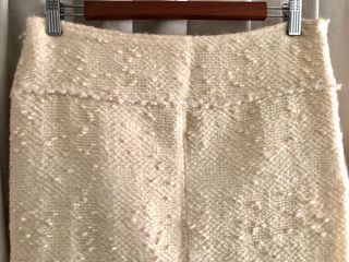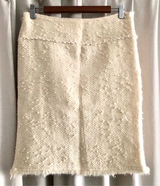 Elegante falda de tweed en color beige. Es una falda de traje de chaqueta(mirar en armario) que esta arreglada y no talla 48 las medidas son: Cintura 41cm Cadera 49cm Largo 57cm En buen estado - Diseño texturizado con detalles. - Acabado deshilachado en el bajo. Detalle tira de lentejuelas con lana.