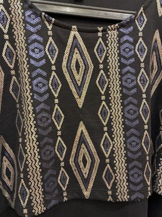 Vestido de manga francesa con un diseño frontal de lentejuelas y algodón. - Diseño de rombos y líneas en la parte superior. - Mangas y falda en color negro liso. - Tejido de algodón cómodo. - Aunque es talla M, talla como una L.