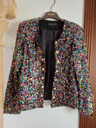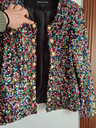 Elegante chaqueta con lentejuelas brillantes en varios colores. Un diseño llamativo y festivo. - Frontal con botones. - Forro interior negro. Falda corta de lentejuelas a juego.