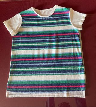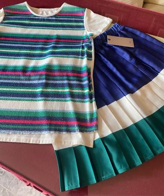Conjunto de camiseta con minilentejuelas y falda plisada. - Camiseta con rayas multicolores y detalles de lentejuelas. - Falda plisada con bloques de color azul, blanco y verde.