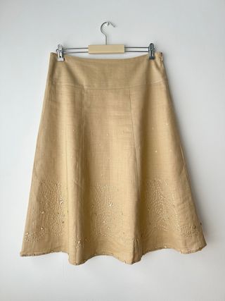 Falda de tejido de ramio en color beige, con un diseño elegante y detalles que la hacen única. Tejido freso. Forro interior - Tejido de ramio. - Adornos de lentejuelas y cuentas en el bajo. - Corte acampanado.