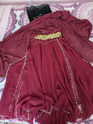 Conjunto de tres piezas para danza oriental. - Top negro con pedrería y tirantes brillantes. - Falda larga de color rojo con detalles de monedas y lentejuelas. -Velo a juego con bordes de lentejuelas
