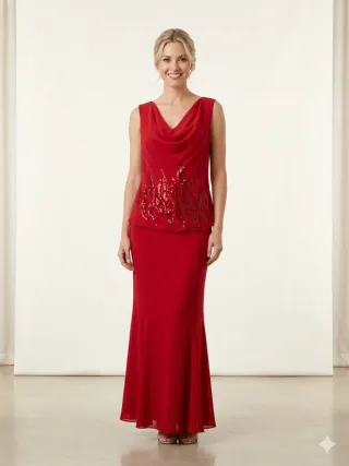 Elegante conjunto de dos piezas en color rojo. - Top sin mangas con escote drapeado. - Adorno de lentejuelas en el corpiño. - Falda larga de corte recto.