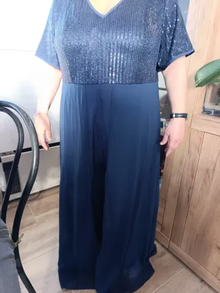Vestido largo por debajo rodilla. ( Según altura) Manga larga , escote espalda y centro pecho. Ligero frunce en laterales de la falda. Tejido muy cómodo. Detalles lentejuelas.