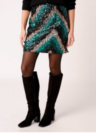 Falda corta con un diseño de tejido texturizado y detalles de lentejuelas. - Diseño de tejido a rayas y cuadros. - Adorno de lentejuelas verdes y cuentas a lo largo de la parte delantera.