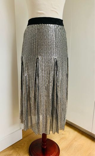 Falda midi de la marca Maje con un diseño de lentejuelas plateadas y detalles plisados. La cintura es elástica color negro con la M bordada. Talla 36-S