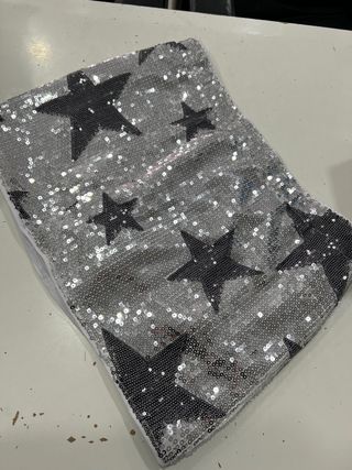 Falda corta con un diseño de estrellas negras sobre lentejuelas plateadas. - Diseño de estrellas. - Acabado brillante de lentejuelas.