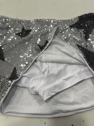 Falda corta con un diseño brillante y llamativo. - Cubierta de lentejuelas plateadas. - Estrellas negras integradas en el diseño. - Cintura elástica para mayor comodidad.
