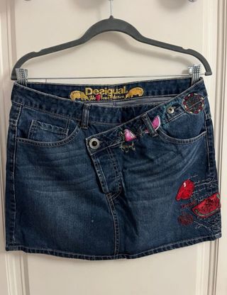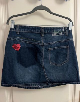 Falda tejana de la marca Desigual con un diseño juvenil y divertido. - Detalle de corazón con lentejuelas rojas. - Bordado mx fun and love en hilo dorado. - Parche de la marca en la parte trasera.