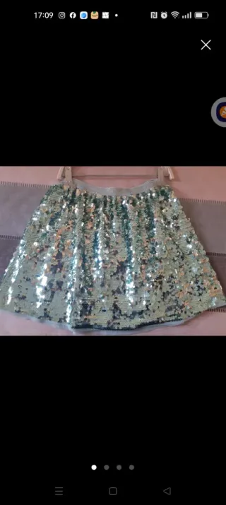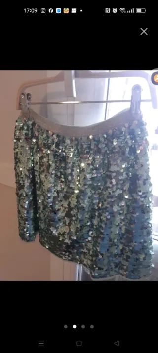 Elegante falda con lentejuelas que aportan un toque brillante. - Diseño con lentejuelas. - Acabado metalizado. Usada una vez