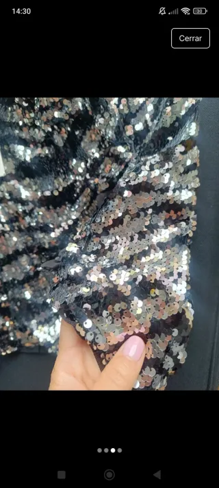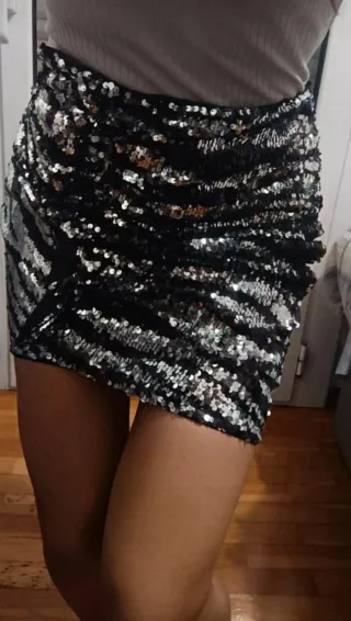 OFERTAZA.VENTA EN PERSONA. Podría rebajarla un poco más. Minifalda corta con lentejuelas plateadas sobre fondo negro. Ideal para eventos o salidas nocturnas. - Diseño con lentejuelas. - Acabado brillante.