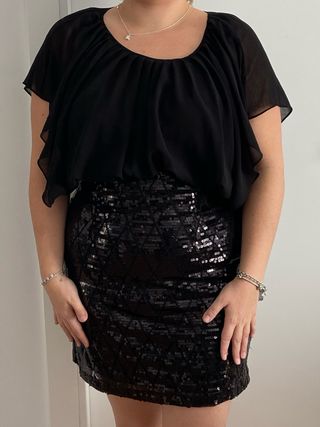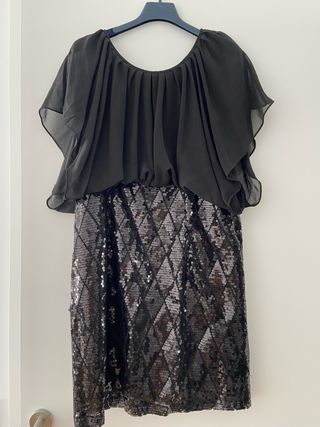 Elegante vestido negro con detalles de lentejuelas, perfecto para eventos especiales. Su diseño combina un corte moderno con un toque festivo. - Cuerpo del vestido en tejido negro. - Falda con capa de lentejuelas brillantes. - Mangas cortas abullonadas. Chaqueta opcional nueva a estrenar de sfera 25€