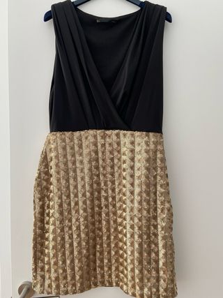 Vestido fiesta lentejuelas dorado, negro chaqueta.