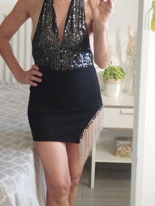 Conjunto negro de brillito. Falda mini con apertura por la parte de atrás y cintura con goma elástica. La falda es una 28 pero al llevar la goma da para una XS y si se quita para una XL como mucho. El top es una XS