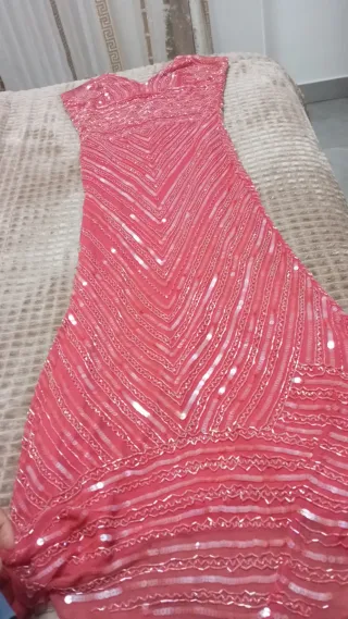 precioso conjunto de fiesta,usado en una ocasión,es falda larga,corpiño de tirantes y discretas lentejuelas transparentes y va con foulad,comprado en pilar Prieto