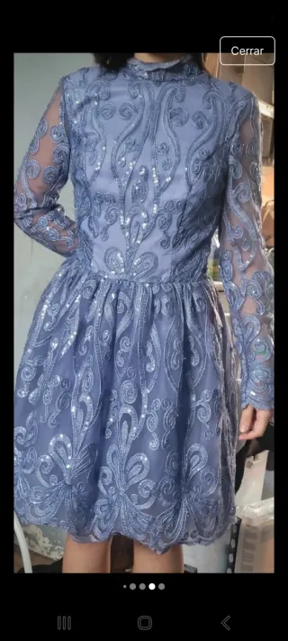 Vestido de fiesta con lentejuelas brillantes. Favorece mucho, perfecto estado usado en una ocasión - Mangas largas acampanadas. - Detalle fruncido en la falda. - Espalda al aire