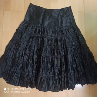 FAlda de vuelo con largo por encima de las rodillas. 100% algod ́ on, negra con bordados y lentejuelas. Cintura el ́astica. Est ́a usada pero bien cuidada.