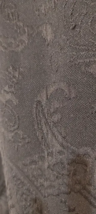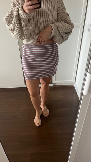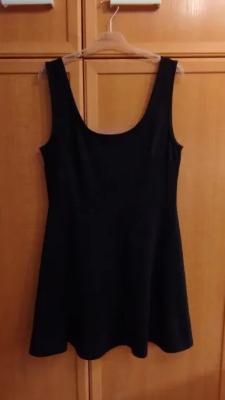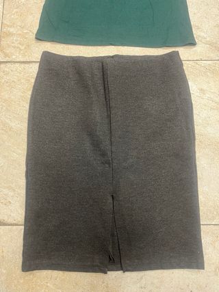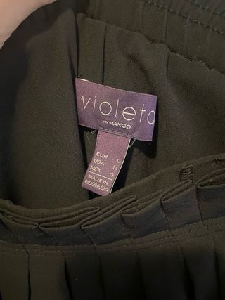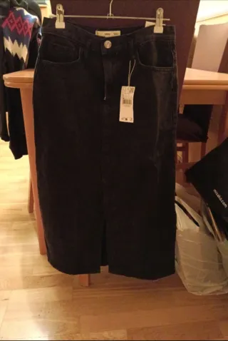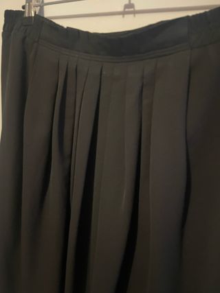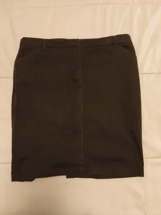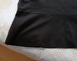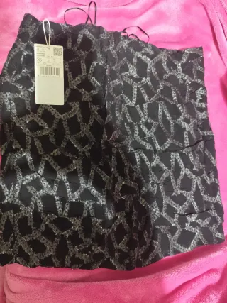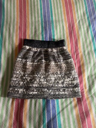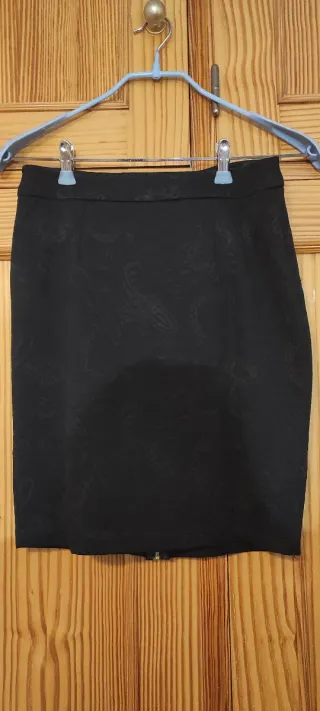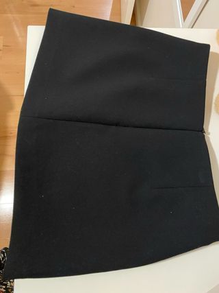 - Cintura con banda negra. No es elástica. Medida entre costuras: unos 33-34 cm. - Largo por encima de la rodilla. 39 cm de arriba a abajo. - Tela con textura.