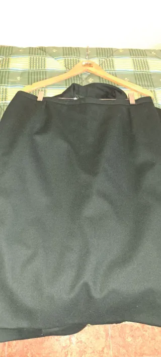 Traje Chaqueta de vestir de color verde botella - 100% lana virgen. - Diseño clásico con solapas. - Cierre de botones. - Bolsillos frontales. - Falda con cremallera trasera y raja en parte de atrás. - Medidas falda 92 cm cintura, largo 67 cm. - Medidas chaqueta 120 cm de pecho, largo 69 cm y largo manga 65 cm.