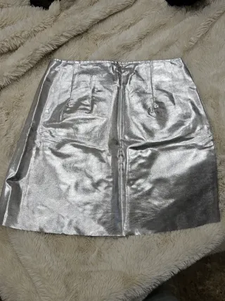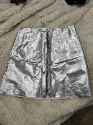 Falda corta con acabado metalizado brillante. Presenta un diseño moderno con cremallera frontal y bolsillos. - Cremallera completa en la parte delantera. - Dos bolsillos delanteros. - Tiro alto.