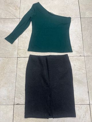 Conjunto de dos prendas de Mango: una camiseta de un hombro y una falda. - Camiseta de manga larga con diseño asimétrico. - Falda de corte recto con abertura frontal.